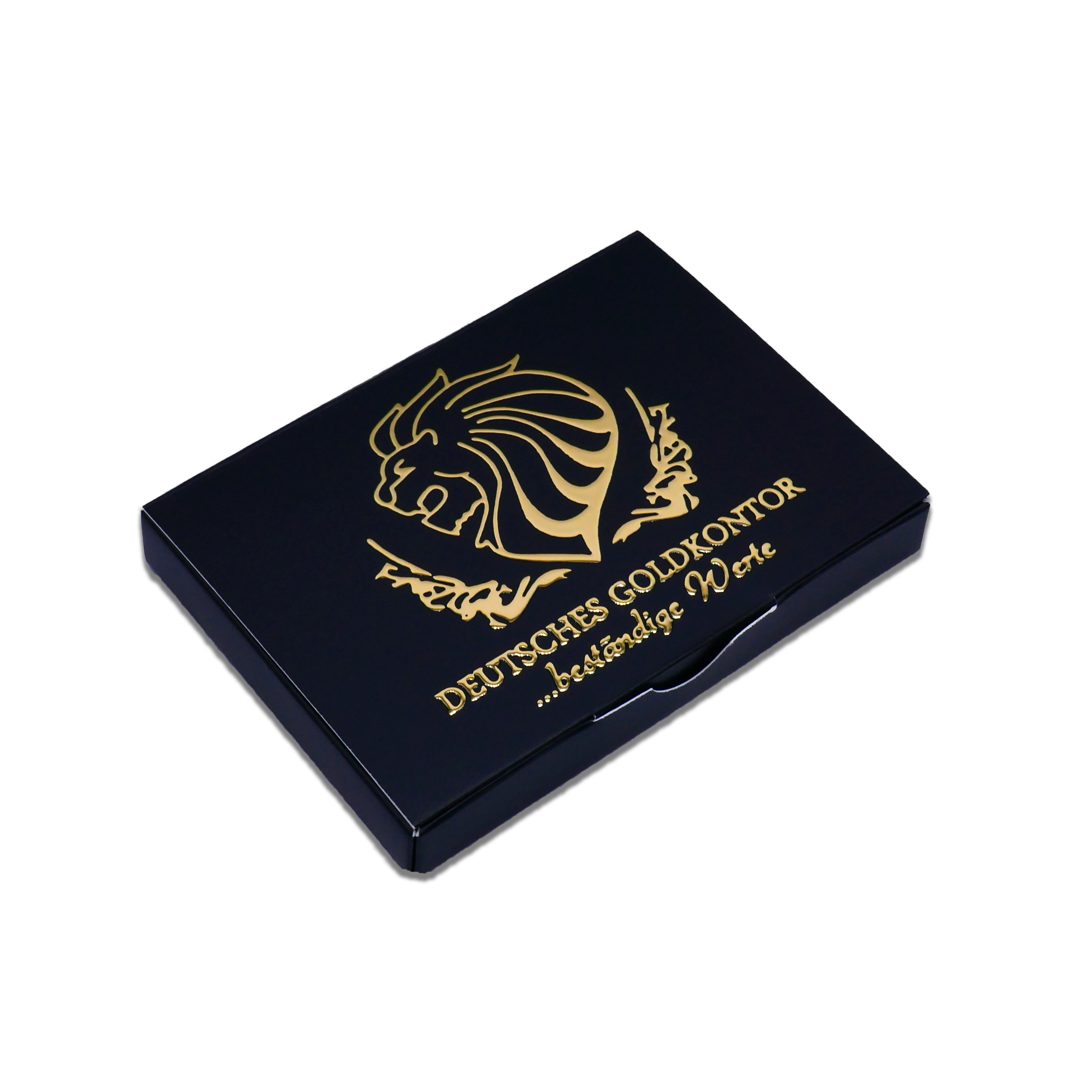 Deutsches Goldkontor – schwarze Geschenkverpackung mit goldenem Aufdruck – für Motivkarten und Goldbarren